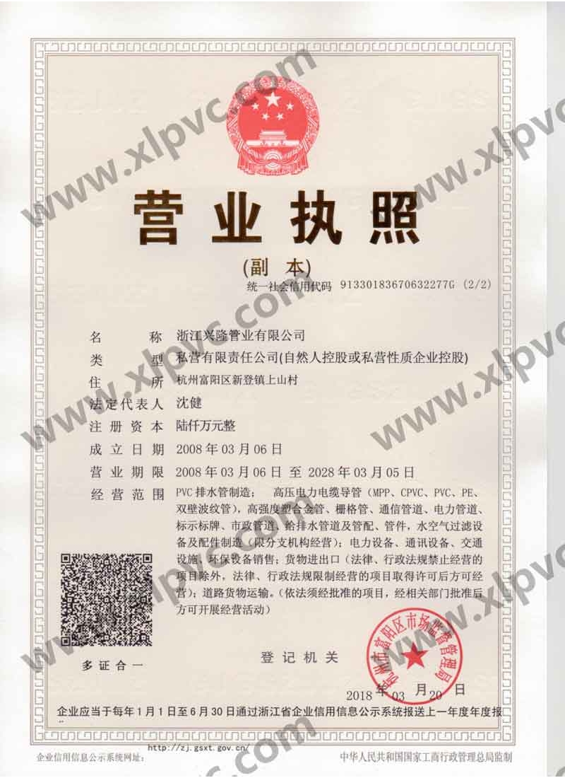 浙江興隆管業(yè)有限公司位于杭州市富陽區(qū)(杭州第九新區(qū)),坐落在新登鎮(zhèn),相距杭州僅60公里,水、陸、空交通運輸十分便利。浙江興隆管業(yè)有限公司前身為富陽興隆塑料制品廠,成立于1992年,2008年改名浙江興隆管業(yè)有限公司,數(shù)十年來,公司一直至力于管道的生產(chǎn),目前公司擁有國內(nèi)先進的CPVC保護管生產(chǎn)線,HPVC()雙壁波紋管生產(chǎn)線,多孔管生產(chǎn)線,玻璃鋼電纜保護管生產(chǎn)線、MPP電纜保護管生產(chǎn)線。生產(chǎn)的主要產(chǎn)品有:CPVC電纜保護管、MPP電力電纜保護管(頂管)、高強度塑合金管、HDPE給排水管、HPVC()雙壁波紋管、玻璃鋼電纜保護管、埋地通信用的PVC-U多孔管、PE直壁管、PVC-U雙壁波紋管、梅花管等,年生產(chǎn)能力達20000萬米。